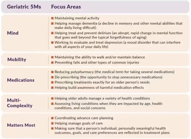 美國(guó)老年性疾病協(xié)會(huì)在其年會(huì)上提出了“老年性5M原則”,這是一套綜合性的護(hù)理和康復(fù)方案,專門針對(duì)老年人在跌倒和骨折后的康復(fù)需求。