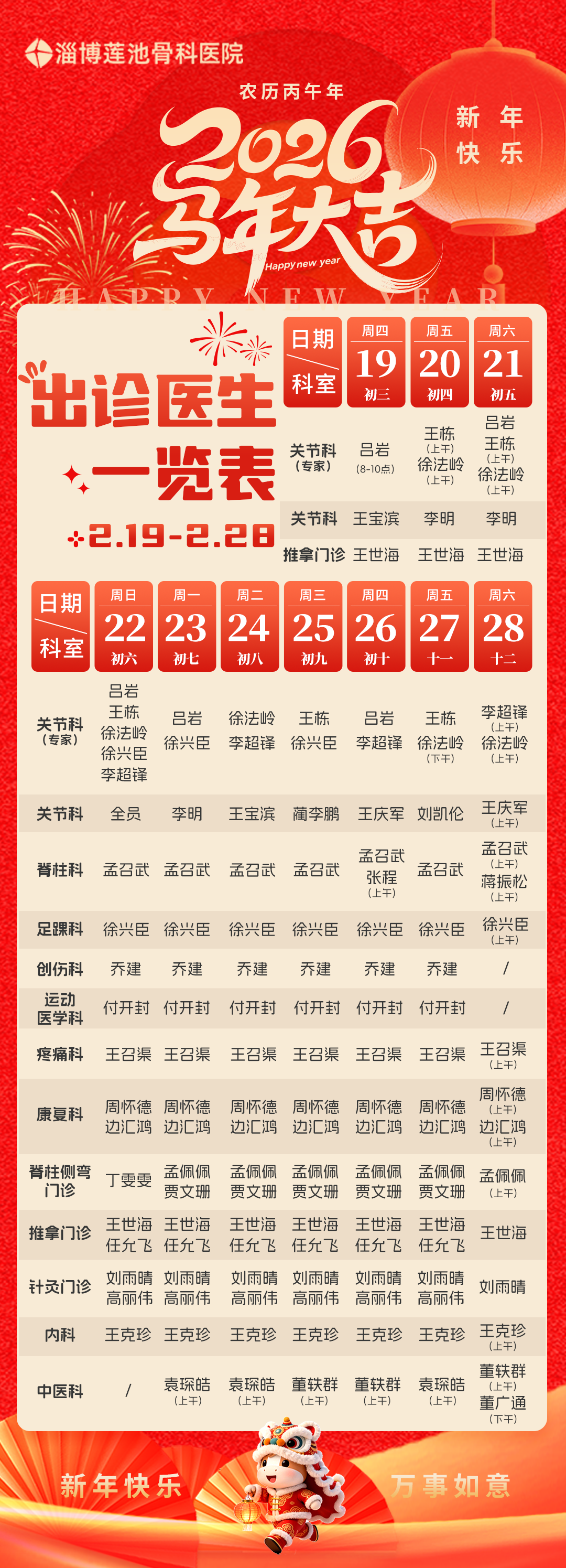 馬躍神州百業(yè)興春節(jié)門診排班春歸大地千山秀親愛(ài)的患者朋友:新春將至,為方便您節(jié)日期間就醫(yī),現(xiàn)將我院【春節(jié)門診排班表】送上。假期里我們依然用心守護(hù)健康,門診具體安排請(qǐng)見(jiàn)下文。祝您和家人身體健康、馬年大吉!--- 門診排班 ---HAPPY NEW YEAR -=== 假期溫馨提示 ===新春佳節(jié),喜樂(lè)相伴,安全為先。為守護(hù)大家的假期平安與舒心,特此溫馨提醒各位伙伴、朋友,注意以下事項(xiàng),共度祥和馬年:平