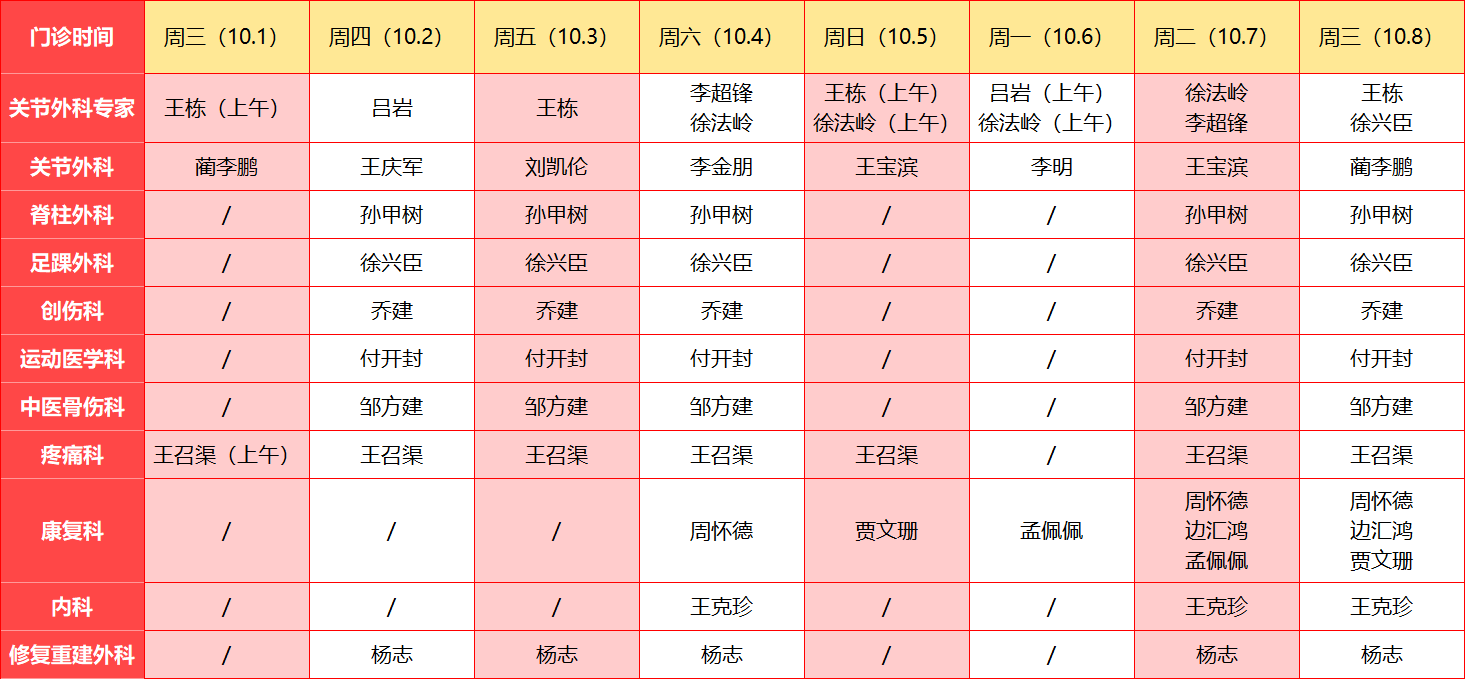 為充分保障廣大人民群眾的身心健康,使大家度過一個安全,愉快,祥和的國慶中秋佳節(jié)。我院2025年國慶期間(10月1日—8日)門診正常開展診療業(yè)務(wù),具體值守情況詳見2025年國慶門診排班表。??國慶門診安排來啦!10月1日-8日:蓮池骨科醫(yī)院在線守護(hù),遇到緊急情況別慌張!門診正常開放,預(yù)約就診超方便,骨科問題一站式解決!記得收藏這份排班表哦,健康不迷路~??愿你國慶快樂,健康平安每一天!????