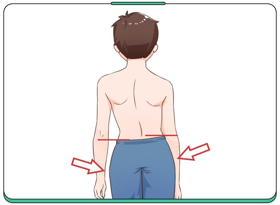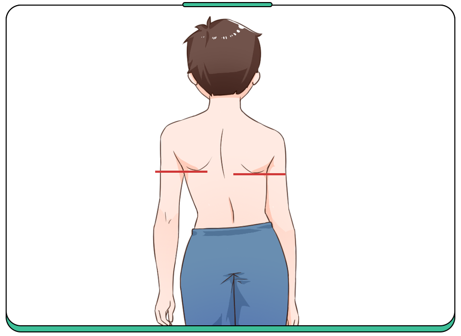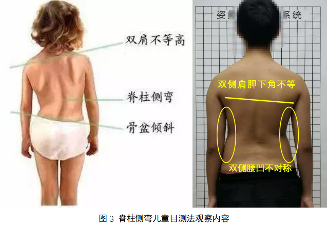主要讓孩子上身裸露(男)或上身穿內(nèi)衣(女),雙足與肩等寬,身體放松自然站立,從背面觀(guān)察患者雙肩是否等高、左右肩胛骨在脊柱兩側(cè)是否對(duì)稱(chēng)、骨盆是否水平等。