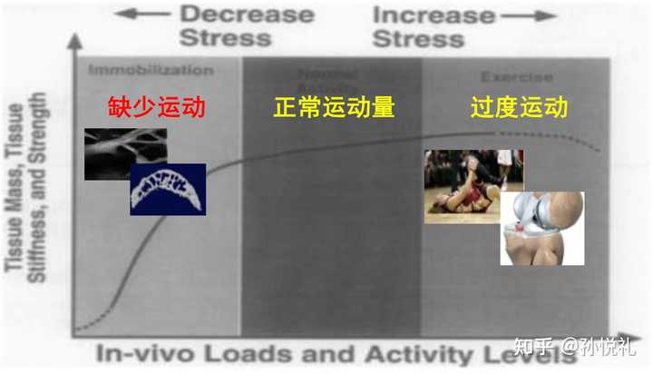人體的任何組織都不能用“用進(jìn)廢退”或者“越用越廢”簡(jiǎn)單概括的~~ 翻出一篇古早文獻(xiàn)的配圖。 骨骼、軟骨、韌帶、肌腱等,它們的強(qiáng)度和受力之間不是線性的關(guān)系。 缺乏運(yùn)動(dòng),應(yīng)力不夠,強(qiáng)度和剛性比較小。 通過(guò)運(yùn)動(dòng)量的增加,強(qiáng)度和剛性會(huì)逐漸增大(用進(jìn)廢退),但這也不是無(wú)限增加,強(qiáng)度始終會(huì)趨于穩(wěn)態(tài)。 當(dāng)運(yùn)動(dòng)量過(guò)度,強(qiáng)度和剛性難以承受持續(xù)累積的應(yīng)力或者